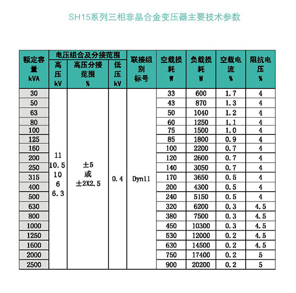 SH15-M-30~2500/6~10系產品,空載損耗在GB/T6541標準值基礎上下降70%。執行標準GB/T25446-2010《油浸式非晶合金鐵心配電變壓器技術參數》。